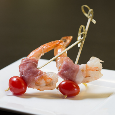 Pan-grilled large shrimp on a skewer with a sweet chili glaze.
