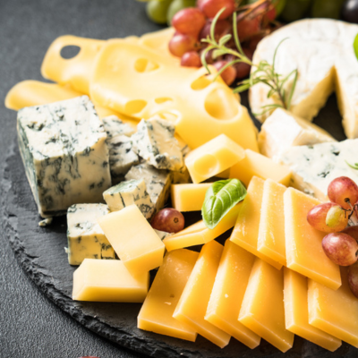 An assortment of gourmet cheeses including French Brie, Manchego, Aged Gouda, and Dubliner served with fresh grapes, olives, fig jam, crackers, and sliced baguette. (subject to change)