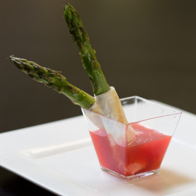 Crispy Phyllo-Wrapped Asparagus, dipped in sweet chili sauce. Served in a small square cup.