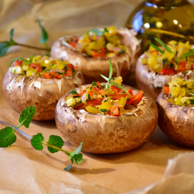 Mushrooms filled with a savory mix of chopped vegetables, breadcrumbs, and Parmesan, baked until golden.